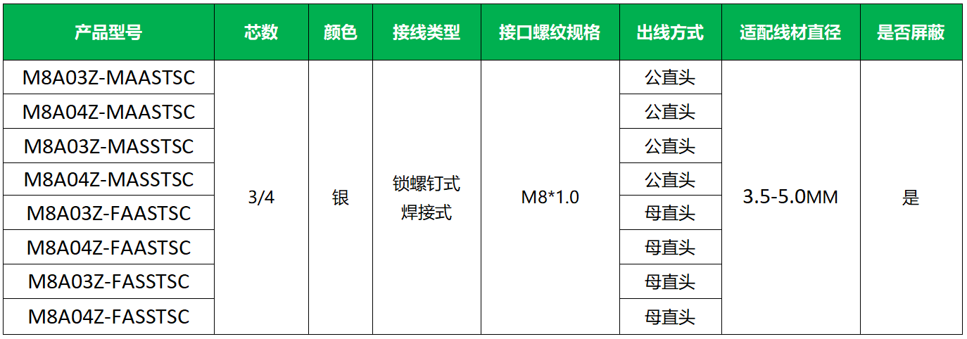 提供锁螺钉、焊接两种接线方式,3/4芯规格齐全,公母直头适配多样场景;支持3.5-5.0mm 线材,无需额外适配,简化选型。