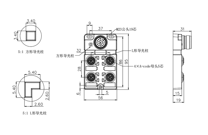 4×M12 A-code 5芯母头:4A M23 19芯公头:8A/10A -