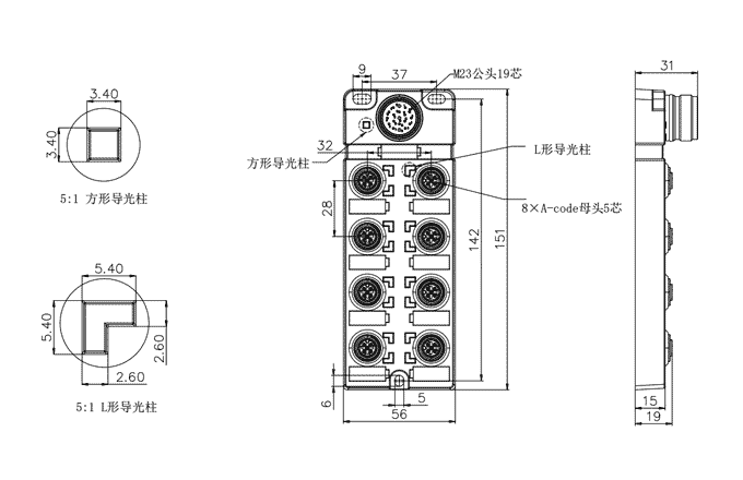 8×M12 A-code 5芯母头:4A M23 19芯公头:8A/10A -